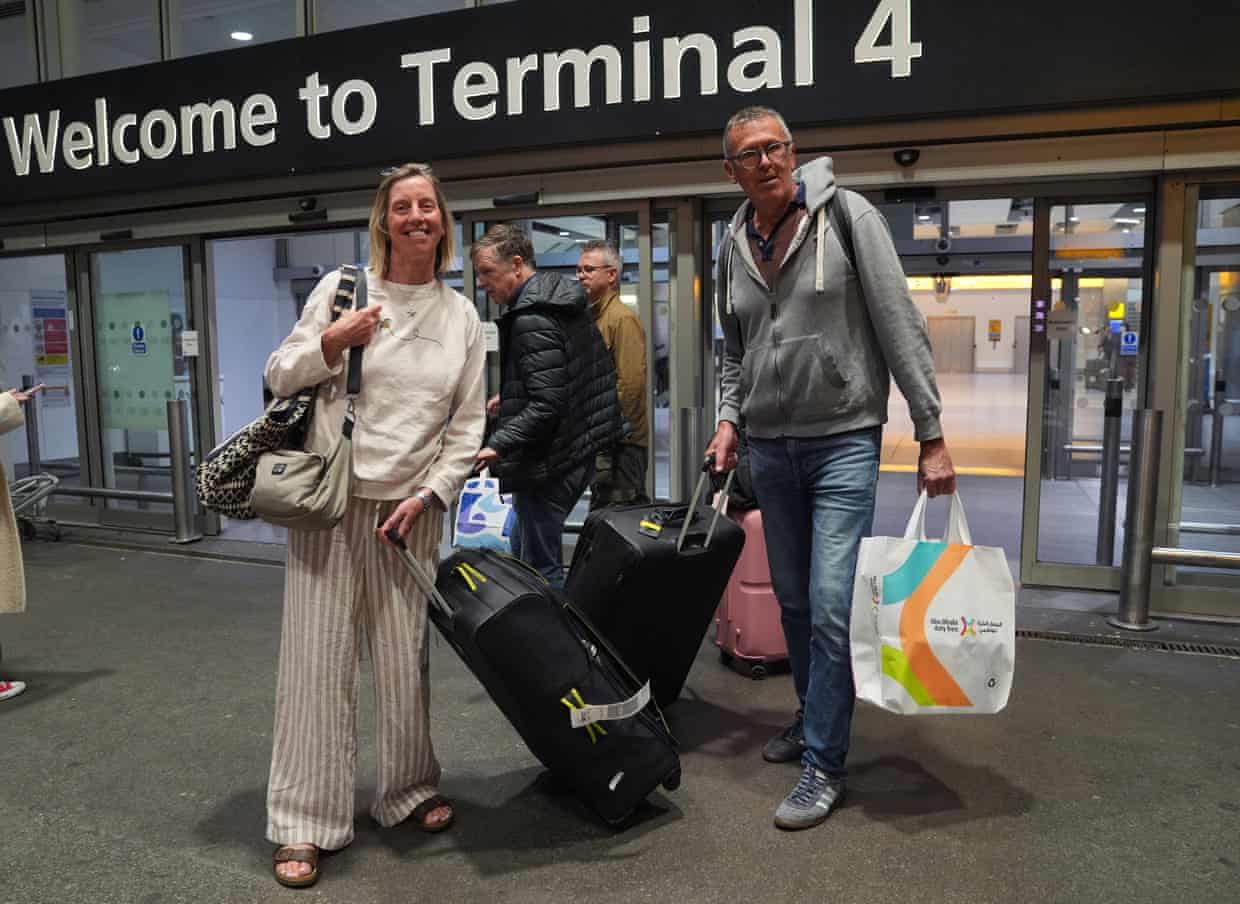 British citizens Lindsay and Ric Elvidge, from Somerset, arrive at Heathrow Airport from Abu Dhabi. Photograph: Yui Mok/PA