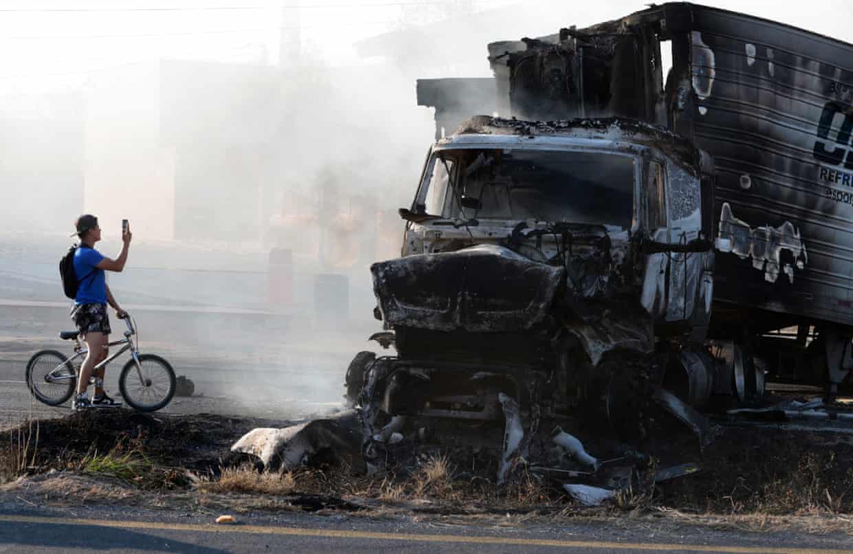 As the unrest grew, Jalisco’s state governor, Pablo Lemus Navarro, urged its 8 million citizens to stay at home “until the situation is brought back under control”. Lemus said public transport services were being suspended and that people should not travel on the state’s roads because of the “violent events” that had spread to at least five parts of the country.
